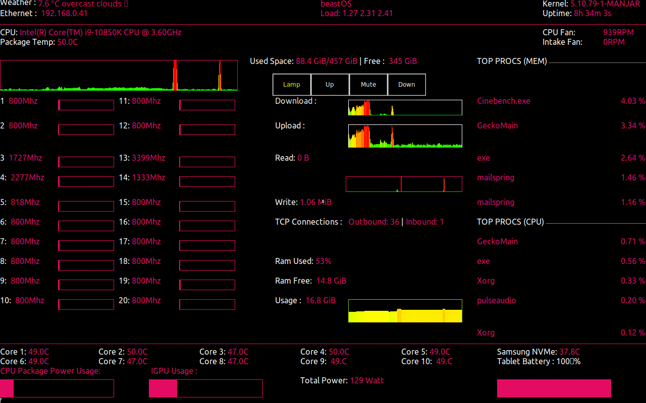 SourcesSource Available: Pending ReviewCollection of software with an android tablet acting as a wireless display. This was accomplished by creating a virtual monitor using xrandr, forwarding this via VNC then using Conky as our front end. Python was used to create some additional buttons used for touch media controls along with weather controls. ADB is used to control the brightness and sleep cycles of the display using systemD services. Certain third-party utilities were used to gain IGPU & CPU power data.